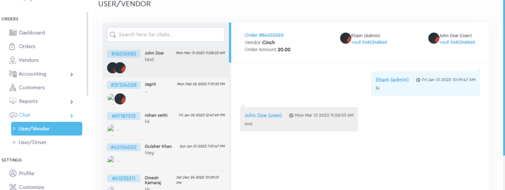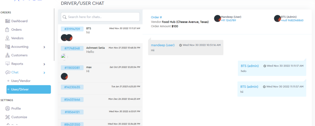 A driver/user chat is a form of communication between a driver and a user in the context of a transportation service. Typically, this type of chat occurs through a mobile application or web platform that facilitates different types of delivery of items or different services opted for by the user on the platform Admin can click on a particular order id to see the user/driver chat.