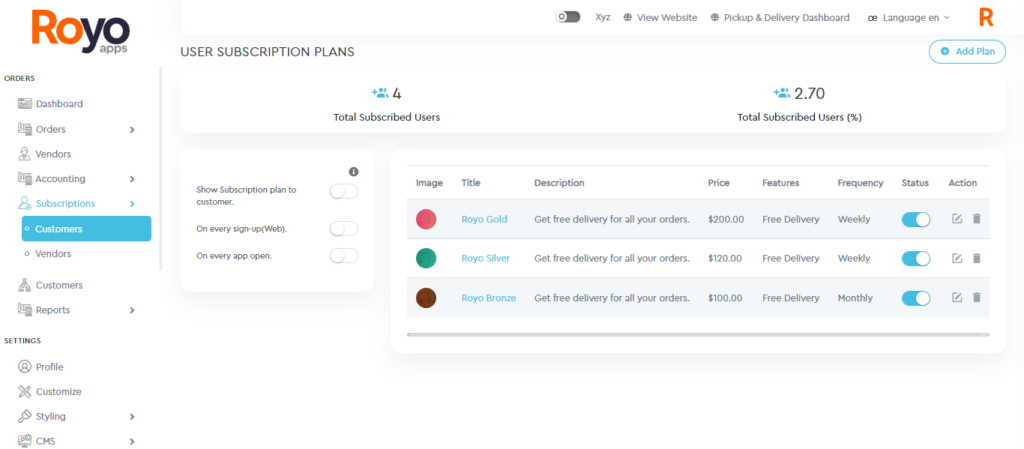 The admin can also add new subscription plans or can edit/delete any existing subscription plan.