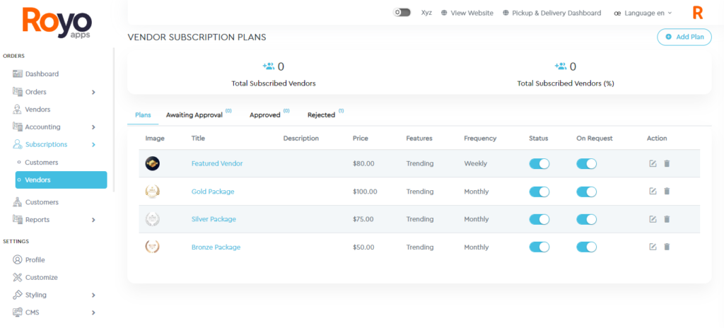 Admin will have the ability to view the list of subscription plans for vendors, along with the number of subscribed vendors and the percentage of vendors subscribed to the total. The list of plans is further divided into awaiting approval, approved and rejected requests by the admin.